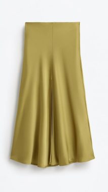 Si quieres salir del clásico negro, esta falda con ligero vuelo en tono lima/oliva es tu mejor aliada. El tejido satinado le da una caída espectacular, ideal para acompañar el ritmo de la noche.