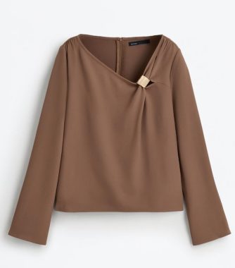 Para las que buscan un toque moderno, este top de manga larga y cuello asimétrico cuenta con un detalle metálico dorado que actúa casi como un accesorio integrado. Un equilibrio perfecto entre sencillez y actitud.