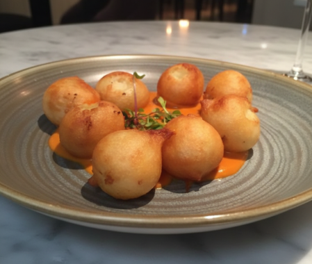 Los torreznos de Fuentidueña llegan con ese crujido que podría ser, perfectamente, el inicio de la Navidad. Las bravas cremosas de Alejandro —homenaje familiar, plato de emoción pura— son un villancico disfrazado de buñuelo: suaves, cálidas, sorprendentes.